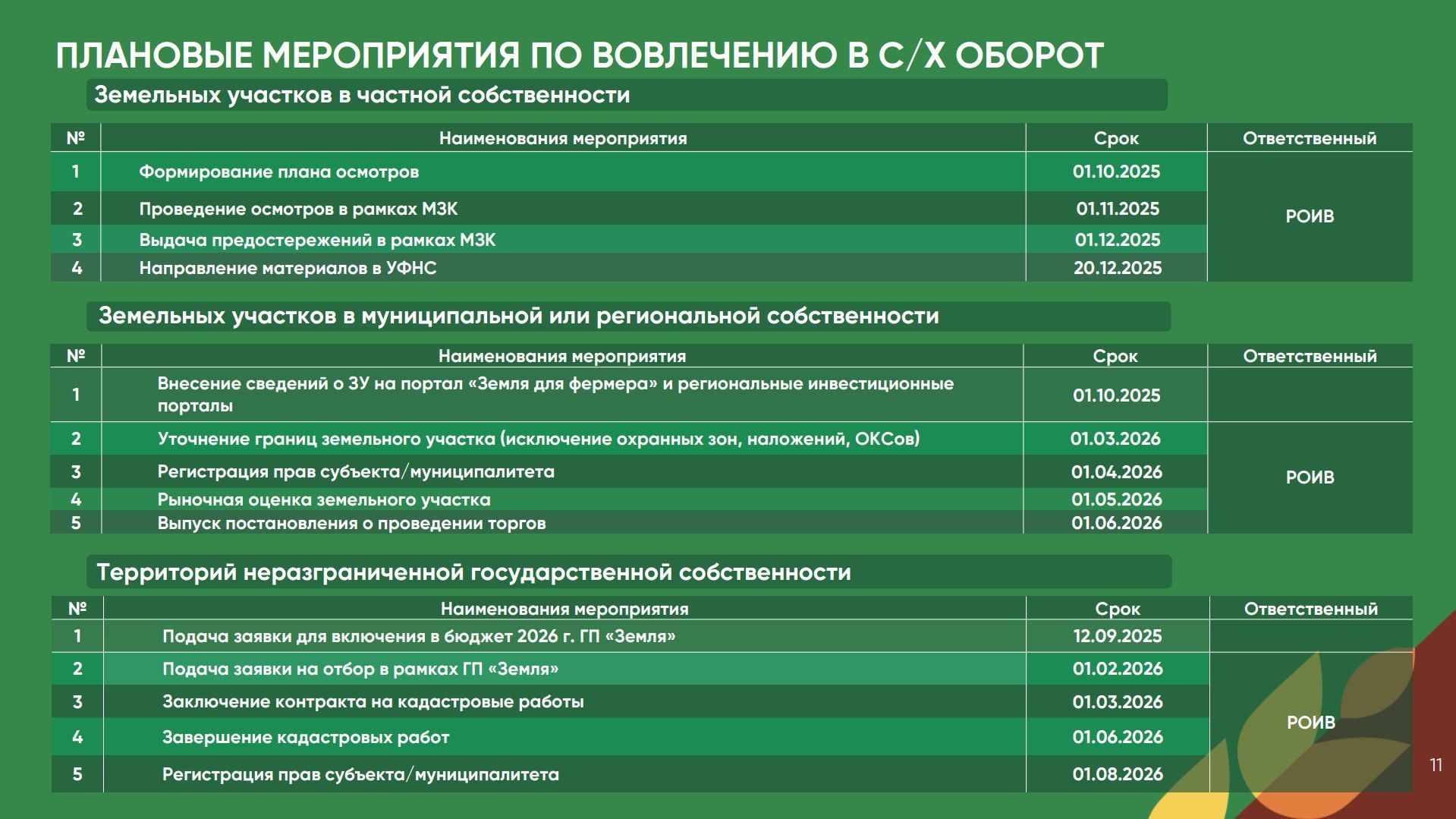 Вячеслав Леонов, директор Департамента земельной политики, имущественных отношений и госсобственности, подчеркнул важнейший результат работ – выявление более 16 млн га неиспользуемой пашни, рекомендуемых для ввода в оборот в первоочередном порядке в 51 регионе России. Большая ее часть находится в государственной собственности (13 млн га, в том числе неразграниченной и непоставленных на кадастровый учет – 7.5 млн га). Для начала сельскохозяйственного использования эти земли требуют проведения кадастровых работ и культуртехнических мероприятий. В 2025 году за счет средств госпрограммы «Земля» такие работы проводятся региональными властями на площади более 500 тыс. га (150% от плана) с последующей оценкой рыночной стоимости земельных участков и организацией торгов. В отношении 3.4 млн га неиспользуемой пашни, находящейся в частной собственности, усиливаются надзорные мероприятия. При неустранении собственником предписаний Россельхознадзора или муниципального земельного надзора ставка земельного налога будет увеличена с 0.3% до 1.5% кадастровой стоимости участка.