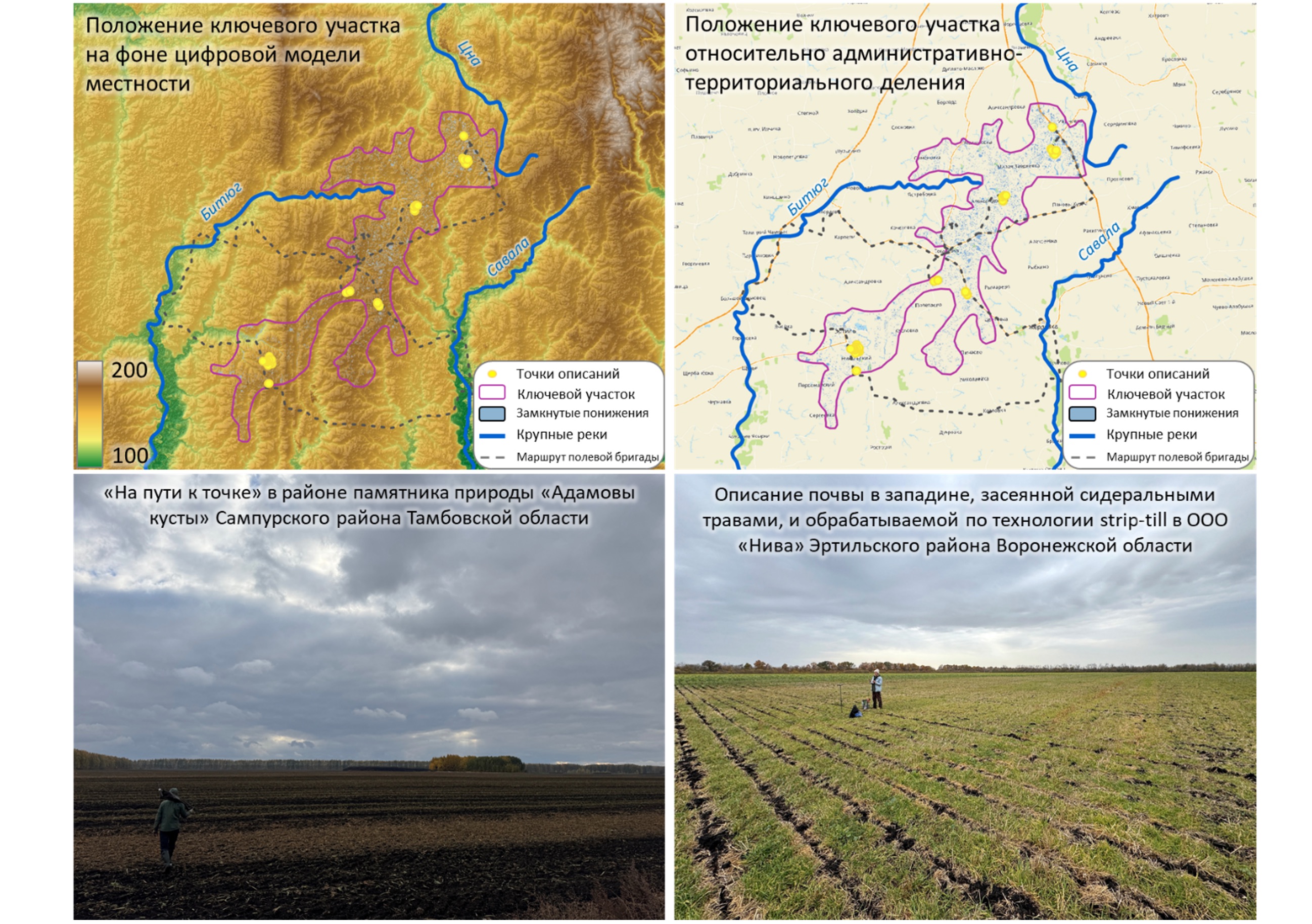 Второе направление исследований было посвящено маршрутной почвенной съёмке Битюг-Эртильского междуречья. Ранее в рамках проекта был детально изучен ключевой участок «Самойлова», расположенный в центральной части междуречья в Токаревском районе Тамбовской области, где были выявлены характерные закономерности строения почвенного покрова недренируемых ландшафтов Окско-Донской низменности. Новой задачей стала оценка ареала распространения выявленных особенностей строения почвенного покрова — определение территории, на которую могут быть экстраполированы тенденции, выявленные на участке «Самойлова». Для решения этой задачи было проведено маршрутное картографирование в самом Токаревском районе и смежных районах: Сампурском Тамбовской области и Эртильском Воронежской области. В рамках него выполнена 71 точка полевого описания почв с отбором образцов из гумусового горизонта. Исследованные участки оказались сходны по структуре почвенного покрова с участком «Самойлова», что позволяет проводить экстраполяцию модели почвенно-ландшафтных связей на всё междуречье.