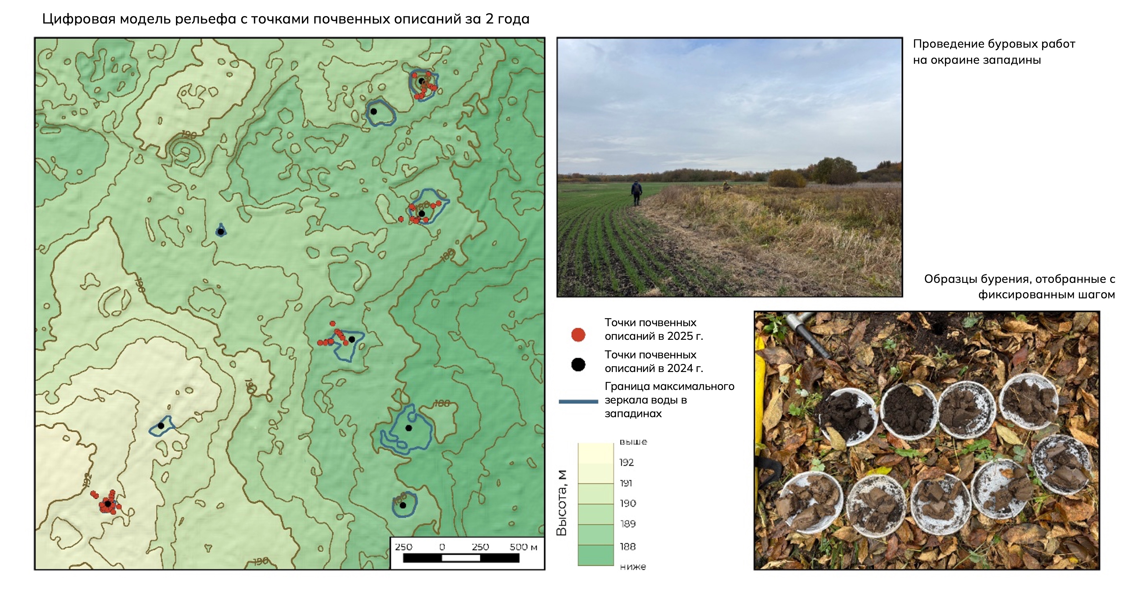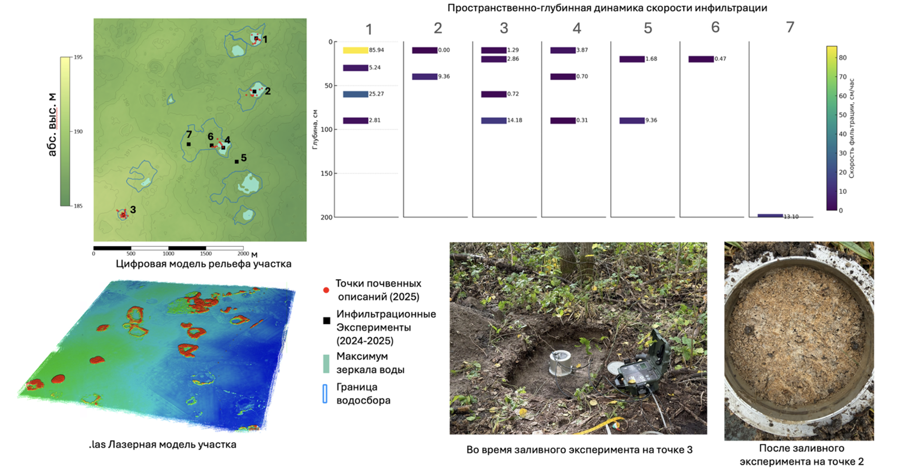 Планирование точек измерений осуществлялось на основе материалов, полученных в предыдущие годы проекта, включая цифровую модель рельефа, построенную по данным лазерного сканирования, а также выявленные морфологические и гидродинамические особенности западинных комплексов. Такой подход обеспечил репрезентативность выборки по ряду морфологических позиций - от днищ западин до выровненных межзападинных пространств. Проведённая серия экспериментов позволила количественно охарактеризовать фильтрационные свойства почв западин различных морфологических типов и провести сравнительный анализ физических свойств почвообразующих пород в пределах западин и на межзападинных участках. Полученные результаты станут основой для параметризации и уточнения генетико-гидродинамической модели территории, направленной на раскрытие механизмов функционирования и реконструкцию пространственно-временной динамики почвенного покрова лесостепи.