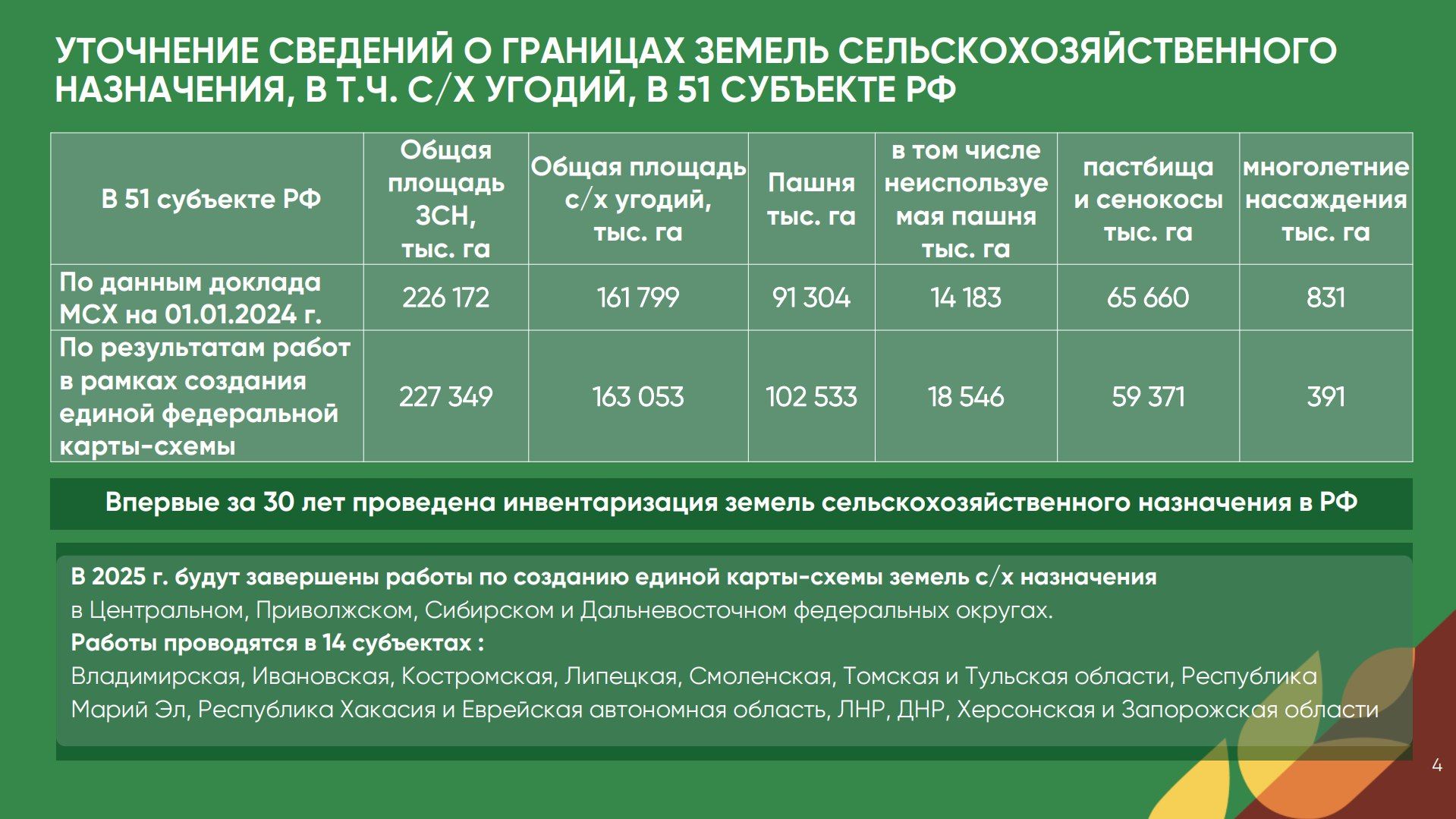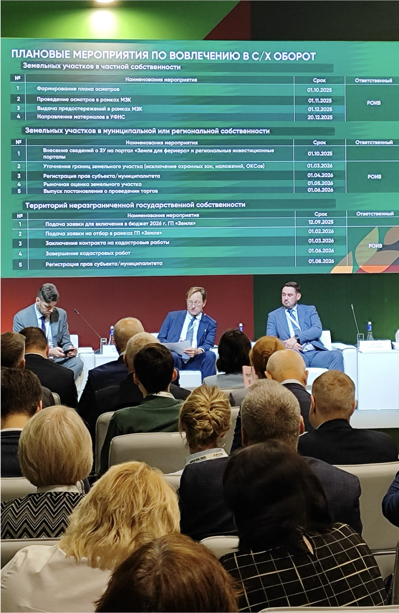 Вячеслав Леонов, директор Департамента земельной политики, имущественных отношений и госсобственности, подчеркнул важнейший результат работ – выявление более 16 млн га неиспользуемой пашни, рекомендуемых для ввода в оборот в первоочередном порядке в 51 регионе России. Большая ее часть находится в государственной собственности (13 млн га, в том числе неразграниченной и непоставленных на кадастровый учет – 7.5 млн га). Для начала сельскохозяйственного использования эти земли требуют проведения кадастровых работ и культуртехнических мероприятий. В 2025 году за счет средств госпрограммы «Земля» такие работы проводятся региональными властями на площади более 500 тыс. га (150% от плана) с последующей оценкой рыночной стоимости земельных участков и организацией торгов. В отношении 3.4 млн га неиспользуемой пашни, находящейся в частной собственности, усиливаются надзорные мероприятия. При неустранении собственником предписаний Россельхознадзора или муниципального земельного надзора ставка земельного налога будет увеличена с 0.3% до 1.5% кадастровой стоимости участка.