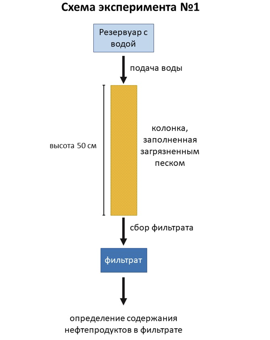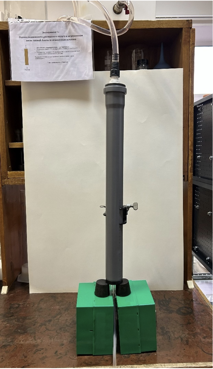 Первая серия экспериментов воспроизводит нисходящую фильтрацию атмосферных осадков в условиях полного водонасыщения загрязненного грунта (рис. 1, 2). Прошедший через заполненную песком колонку раствор будет проанализирован на содержание нефтепродуктов.